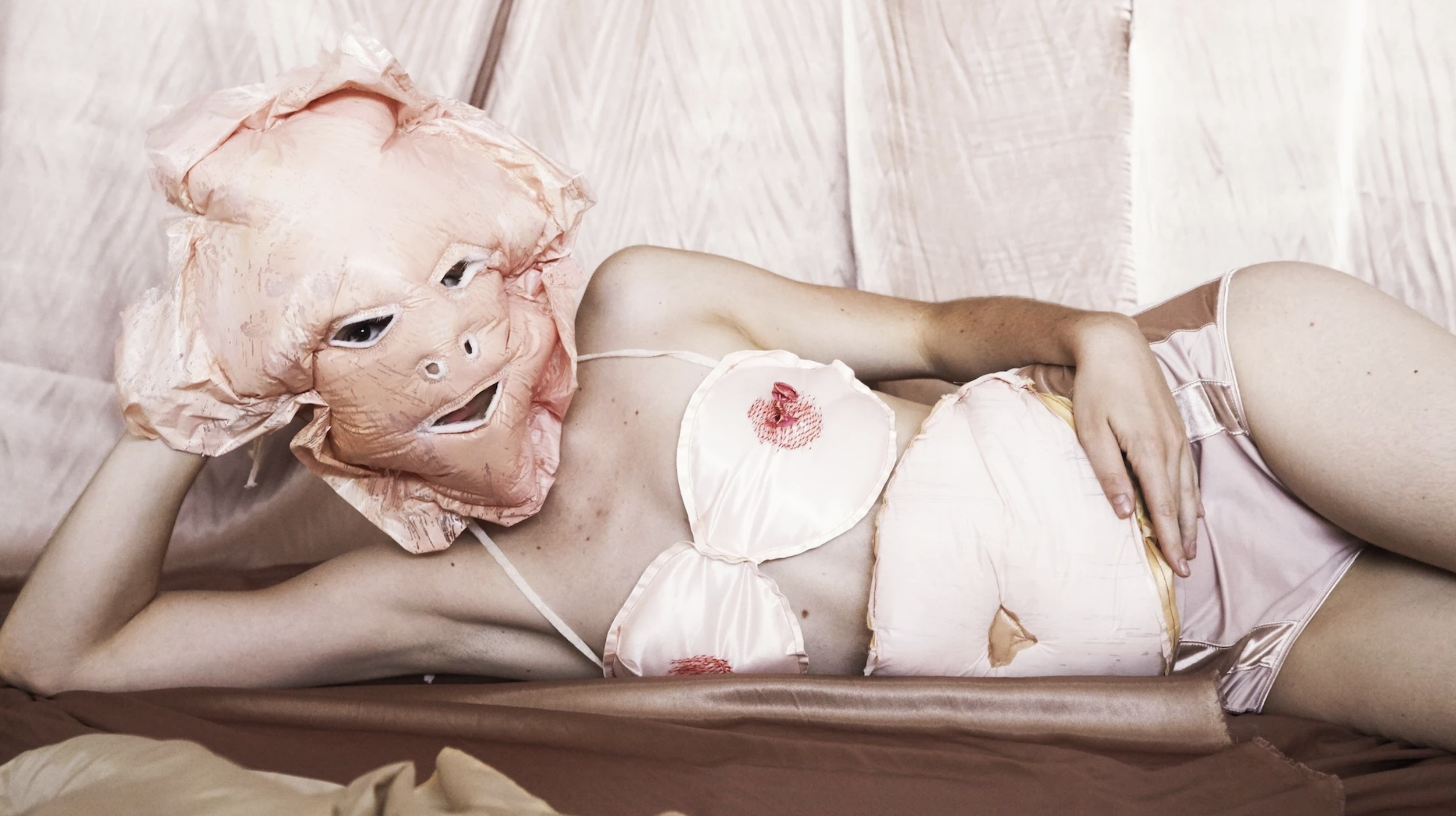 Face Mask, Balloon Tie Tits, Stuffed Belly, Plastic, Plastic Netting, Balloon, Fabric Batting, Polyester Fabric, Acrylic Paint, Cotton Ties, Thread, 2015.